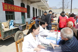 蓝天中医院医疗志愿者现场为村民量血压、咨询健康问题。