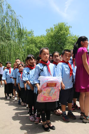 当爱心车队驶进学校的时候,全校师生排着整齐的队列站在校门两边迎接着爱心车队的到来,120多个孩子的脖领上系着鲜艳的红领巾,朝气蓬勃的面孔喜笑颜开。当大家把新书包及其它用具搬下车时,刚才还排着整齐队列的孩子们瞬间涌了上来,围着桌子上崭新的书包,玩具,眼睛里充满了渴望和兴奋。
